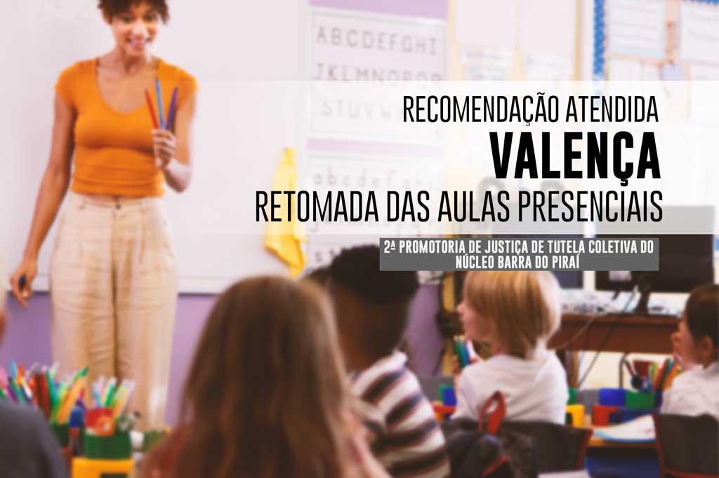 O Ministério Público do Estado do Rio de Janeiro (MPRJ), por meio da 2ª Promotoria de Justiça de Tutela Coletiva do Núcleo Barra do Piraí, teve atendida a recomendação feita ao Município de Valença para que promova a retomada imediata das aulas presenciais na cidade.