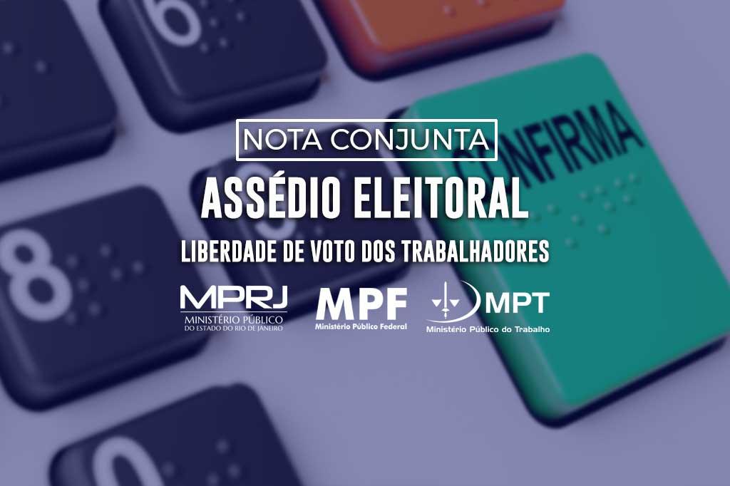 Assinada pelo procurador-geral de Justiça do Rio de Janeiro em exercício, Antonio José Campos Moreira, pela procuradora regional Eleitoral no RJ, Neide Cardoso de Oliveira, e pelo procurador-chefe em exercício do MPT/RJ, Fabio Goulart Villela, a nota reafirma o compromisso das três instituições de garantir que os direitos fundamentais do trabalhador sejam respeitados, em conformidade com a legislação em vigor e informa que todas as denúncias de assédio eleitoral serão apuradas com rigor e encaminhadas às autoridades competentes para a apuração dos crimes correlatos.