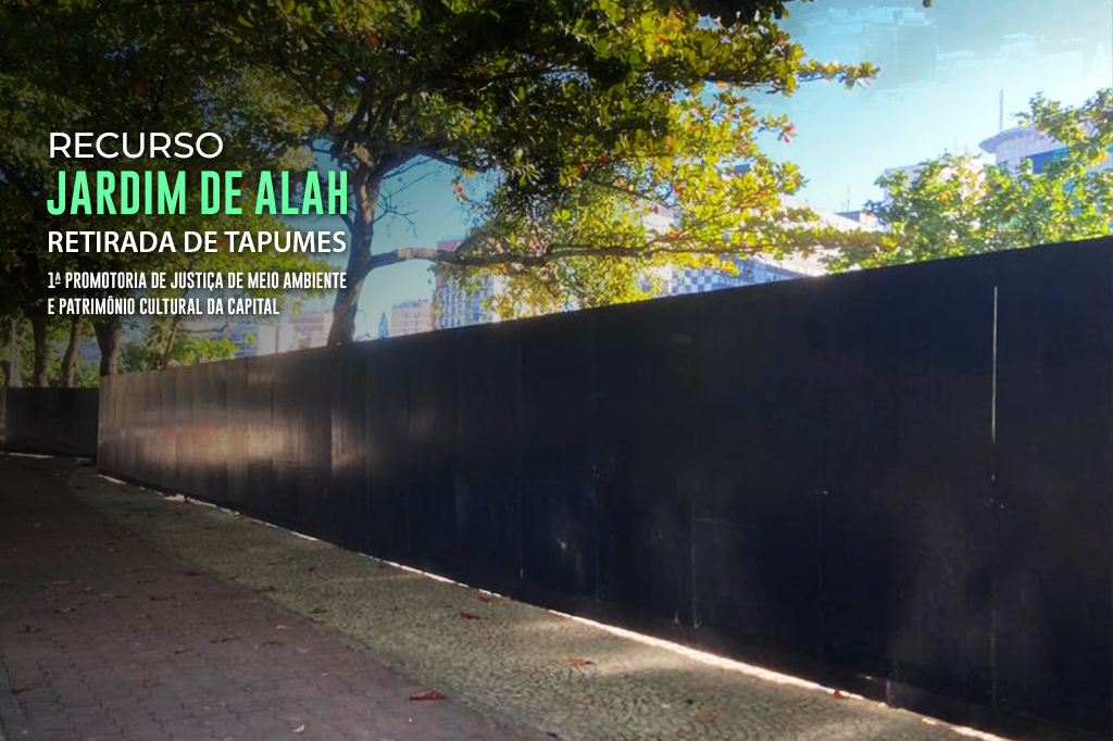Nesta terça-feira (04/06) o Ministério Público do Estado do Rio de Janeiro (MPRJ) apresentou recurso à Vice-Presidência do Tribunal de Justiça, para que seja determinada a retirada dos tapumes instalados ao redor do Jardim de Alah, parque público que divide os bairros de Ipanema e Leblon, na Zona Sul do Rio. A 1ª Promotoria de Justiça de Meio Ambiente e Patrimônio Cultural da Capital busca reformar a decisão que indeferiu o pedido do MPRJ de remoção da barreira que indevidamente cercou a praça pública. Os réus no processo são o Município do Rio, a Companhia Carioca de Parcerias e Investimentos (CCPAR), Consórcio Rio Mais Verde e Accioly Participações.