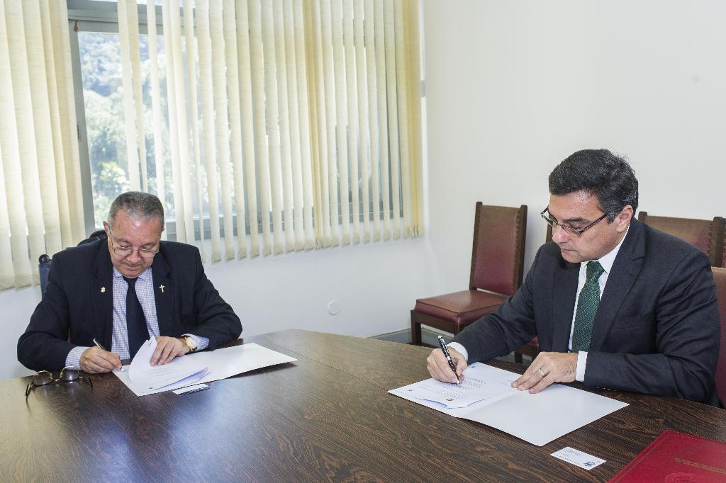 O Ministério Público do Estado do Rio de Janeiro, por meio do Instituto de Educação e Pesquisa (IEP/MPRJ), assinou nesta quinta-feira (21/09) um acordo de cooperação técnica, pedagógica e científica com a Pontifícia Universidade Católica (PUC-Rio). O termo foi firmado em reunião da reitoria da universidade, com a presença do Procurador-Geral de Justiça, Eduardo Gussem; do diretor do IEP/MPRJ, Savio Bittencourt, e do vice-diretor, Leandro Navega. Representando a PUC-Rio, participaram o reitor Josafá Carlos de Siqueira e o coordenador do Departamento de Direito, Francisco de Guimaraens.