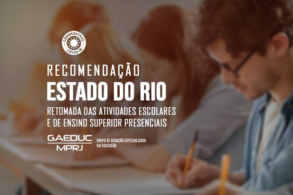 O Ministério Público do Estado do Rio de Janeiro, por meio do Grupo de Atuação Especializada em Educação (GAEDUC/MPRJ) e da 2ª Promotoria de Justiça de Tutela Coletiva de Proteção à Educação da Capital, expediu, na segunda-feira (15/06), Recomendação ao Estado do Rio de Janeiro, à Secretaria de Estado de Ciência, Tecnologia e Inovação (SECTI), à Fundação de Apoio à Escola Técnica (FAETEC), e à Fundação Centro de Ciências e Educação Superior a Distância do Estado do Rio de Janeiro (CECIERJ), para que apresentem, no prazo de 10 dias, plano de ação para retomada das atividades escolares e de ensino superior presenciais. De acordo com a Recomendação, o plano de ação deve ser elaborado após debate e construção com a participação da comunidade escolar e Conselho Estadual de Educação e organizações da sociedade civil.