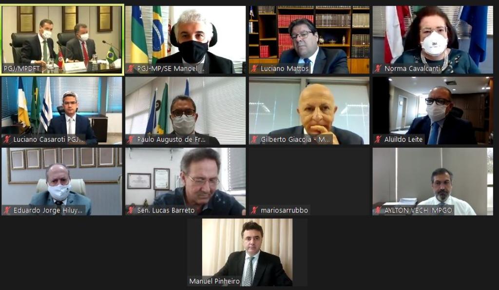 O procurador-geral de Justiça, Luciano Mattos, participou, nesta quarta-feira (14/04), através de videoconferência, da 2ª Reunião Ordinária do Conselho Nacional dos Procuradores-Gerais (CNPG), realizada em Brasília. O subprocurador-geral de Justiça de Relações Institucionais e Defesa de Prerrogativas, Marfan Martins Vieira, compareceu presencialmente ao encontro. Durante a reunião foi eleita por aclamação a nova presidente do CNPG, Ivana Lúcia Franco Cei, procuradora-geral de Justiça do Ministério Público do Amapá, que irá assumir o colegiado no lugar de Fabiano Dallazen, procurador-geral de Justiça do MPRS. “O momento é de união, precisamos agir como grupo, uma força motora direcionada à defesa do Ministério Público brasileiro e das nossas prerrogativas”, disse a nova presidente.
