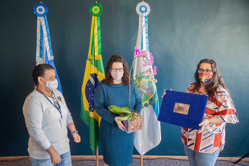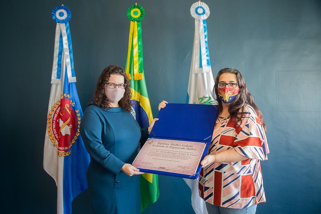 O diploma foi entregue pela coordenadora da CDDM/Alerj, Luciana Targino: "A gente concede essa homenagem pela sua luta, militância em defesa dos direitos da mulher", disse Luciana. Carla Araújo também foi presenteada com uma orquídea, entregue pela assessora da CDDM Márcia Nobua.
