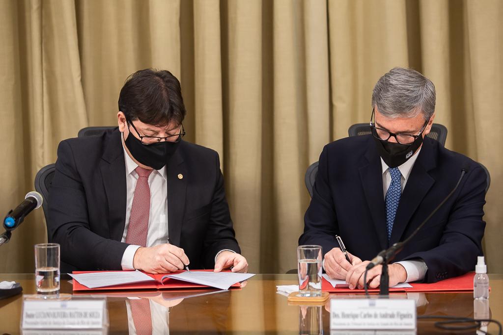 O Ministério Público do Estado do Rio de Janeiro (MPRJ), o Tribunal de Justiça (TJRJ), a Defensoria Pública (DPERJ) e o Estado do Rio de Janeiro celebraram, nesta quarta-feira (30/06), Termo de Cooperação Técnica e Material para implementação de estrutura básica para o funcionamento da audiência de custódia nas dependências da Secretaria de Estado de Administração Penitenciária (SEAP). O acordo foi assinado em solenidade realizada no auditório nobre do TJRJ pelo procurador-geral de Justiça, Luciano Mattos, pelo presidente do Tribunal, Henrique Carlos de Andrade Figueira, pelo defensor público-geral, Rodrigo Baptista Pacheco, pelo secretário de Estado da Polícia Civil, Allan Turnowski, e pelo secretário de Estado de Administração Penitenciária, Raphael Montenegro Hirschfeld.