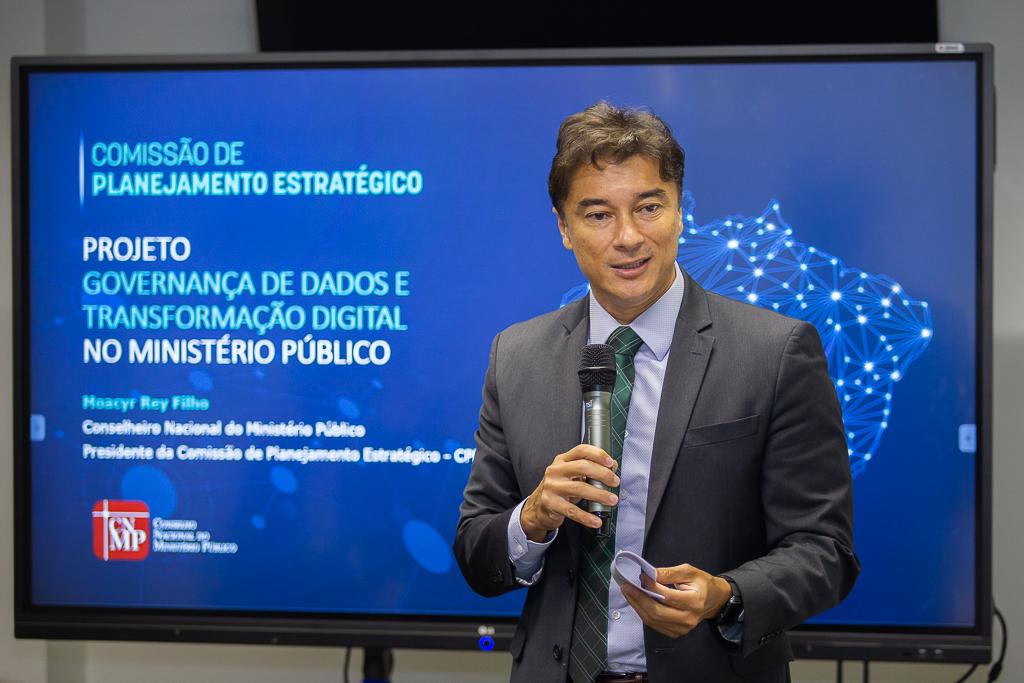 O conselheiro do CNMP Moacyr Rey comentou que a ideia de tomar decisões embasadas em análises de grandes volumes de dados deve ser tratado como uma política institucional. Isso diminui, na avaliação de Moacyr, a disparidade de atuação e aumenta a unidade institucional, ao mesmo tempo em que preserva a independência funcional dos membros. Nesse contexto ele apresentou o projeto “Governança de Dados e Inovação Digital no Ministério Público”, descreveu os objetivos desse projeto, quais iniciativas já foram tomadas e as possibilidades futuras.
