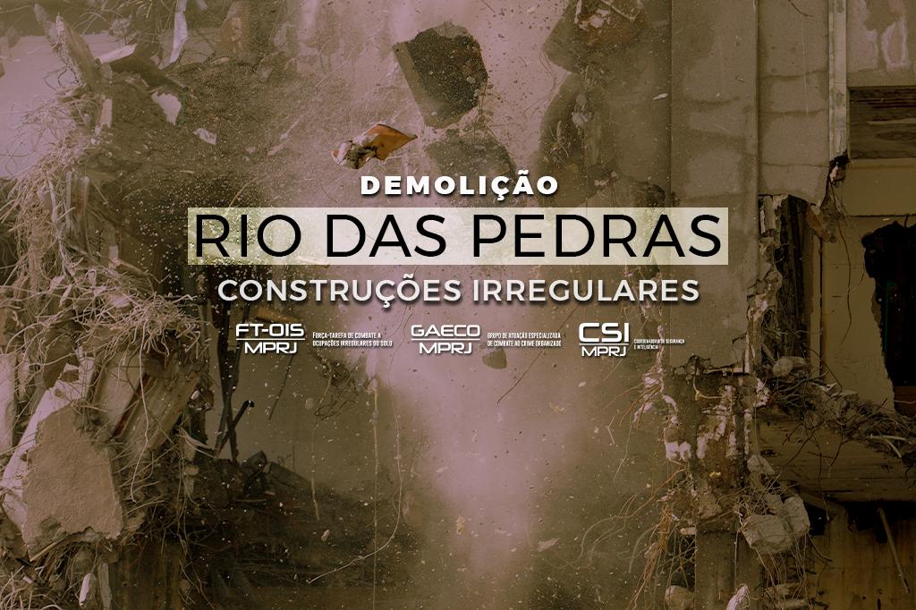 O Ministério Público do Estado do Rio de Janeiro (MPRJ), por meio da Força-Tarefa do Grupo de Atuação Especializada no Combate ao Crime Organizado para enfrentamento à ocupação irregular do solo urbano (GAECO/FT-OIS), com auxílio da Coordenadoria de Segurança e Inteligência (CSI/MPRJ), e em parceria com a Secretaria Municipal de Meio Ambiente, Polícia Militar, Subprefeitura de Jacarepaguá e Companhia Estadual de Limpeza Urbana (Comlurb) realiza, nesta quarta-feira (16/02), operação para demolir 19 construções irregulares em Rio das Pedras, na Zona Oeste do Rio, área dominada pela milícia.