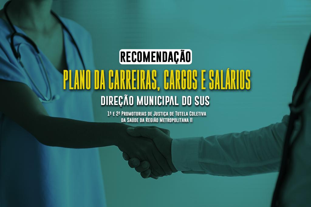 As Recomendações expedidas decorrem de decisão das 1ª e 2ª Promotorias de Justiça de Tutela Coletiva da Saúde da Região Metropolitana II em priorizar como tema para atuação conjunta pelos órgãos de execução a indução do processo de elaboração de aprovação dos PCCS dos profissionais do SUS no âmbito da Região Metropolitana II, razão pela qual deram início a levantamento da realidade da gestão de pessoal no âmbito das Secretarias Municipais de Saúde dos municípios que compõem a Metro II, o que tem demostrado, de um modo geral, a precariedade dos vínculos dos profissionais do SUS em relação às administrações municipais e a ausência de planos de carreira que lhes confiram a necessária valorização.