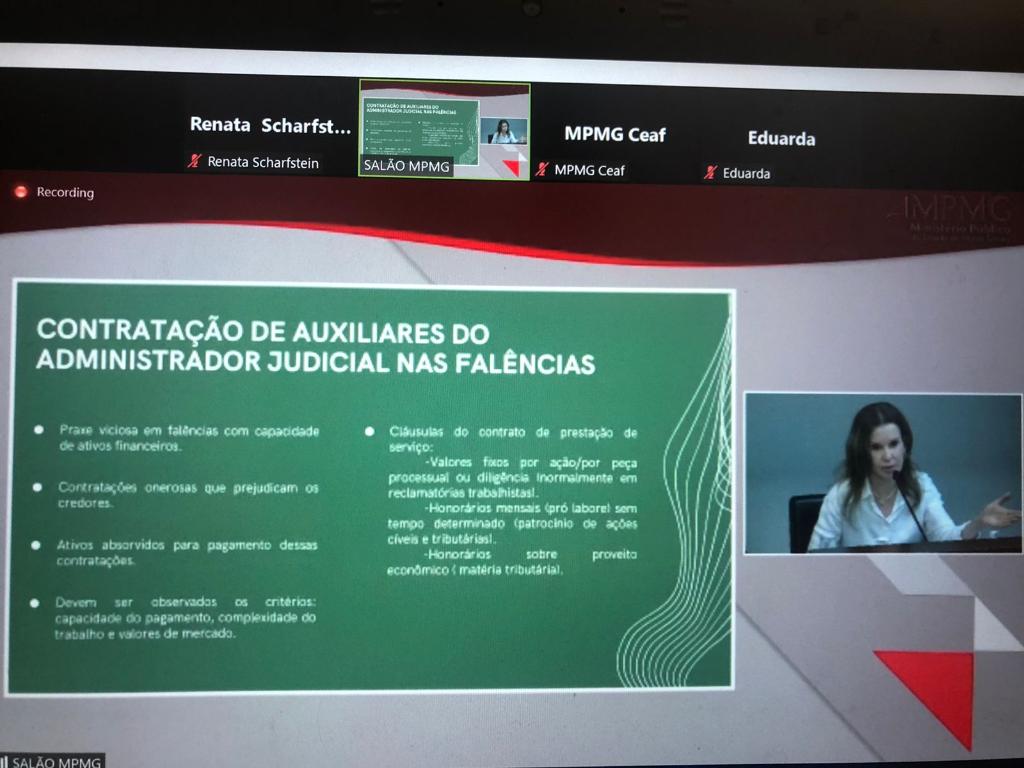 "É importante registrar a relevância dessa capacitação, em tema extremamente caro ao Ministério Público em razão do interesse público e social envolvidos, além da função social das empresas. Questões controvertidas e de necessária discussão, como a importância da intervenção do Ministério Público desde o momento do requerimento da recuperação e falência, cooperação internacional, bem como possibilidade ou não de recuperação de associações foram abordados com brilhantismo nas exposições. Muito rica, ainda, a experiência da Colega Sumaia Chamon (MPMG) com base na experiência do caso Samarco, sendo esse intercâmbio entre Ministérios Públicos essencial para o amadurecimento da atuação e teses institucionais", ressaltou Renata Scharfstein.