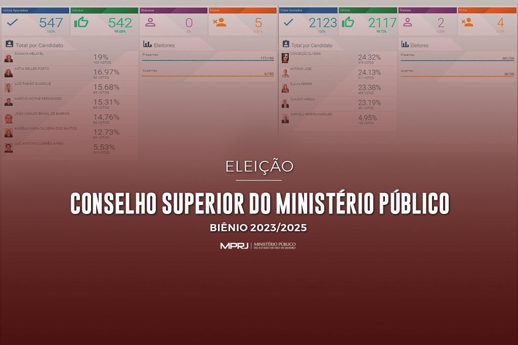 Os membros do Ministério Público do Estado do Rio de Janeiro (MPRJ) elegeram, nesta segunda-feira (07/11), os oito novos integrantes do Conselho Superior do Ministério Público (CSMP) para o biênio 2023/2025. Pelo Colégio de Procuradores de Justiça foram eleitos os procuradores Sumaya Helayel (103 votos), Katia Aguiar Marques Selles Porto (92), Luiz Fabião Guasque (85) e Márcio Mothé Fernandes (83). Foram computados 542 votos válidos, 5 nulos e nenhum branco. Pelo voto dos Promotores de Justiça foram eleitos os procuradores Conceição Maria Tavares de Oliveira (515 votos), Antonio José Campos Moreira (511), Flávia de Araújo Ferrer (495) e Claudio Varela (491). Foram registrados 2.117 votos válidos, 4 nulos e 2 brancos.