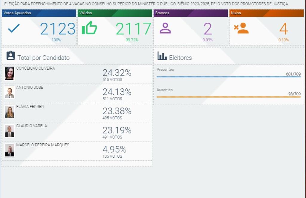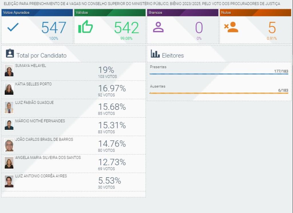 A votação teve início às 10h, de forma online e presencial, e encerrou-se às 18h19, em razão de intercorrência técnica. A procuradora de Justiça Maria Cristina Palhares dos Anjos Tellechea, presidente da Mesa Receptora e Apuradora, agradeceu aos integrantes da mesa, os procuradores de Justiça Alexandre Araripe Marinho e Marcelo Daltro Leite; à diretoria de suporte dos Órgãos Colegiados, Secretaria de Tecnologia da Informação e de Comunicação (STIC/MPRJ), Gerência de Telecomunicações (GETEL) e Pontifícia Universidade Católica do Rio de Janeiro (PUC Rio), responsável pela auditoria.