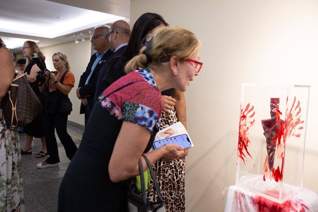 "Nossa proposta é usar a arte como instrumento de informação e impacto, para trazer a conscientização. A exposição fala da paixão, de violência, de como tudo começa e de como tudo pode terminar, que é com o feminicídio", explicou a procuradora de Justiça Carla Araújo, coordenadora do CAO Violência Doméstica/MPRJ.
