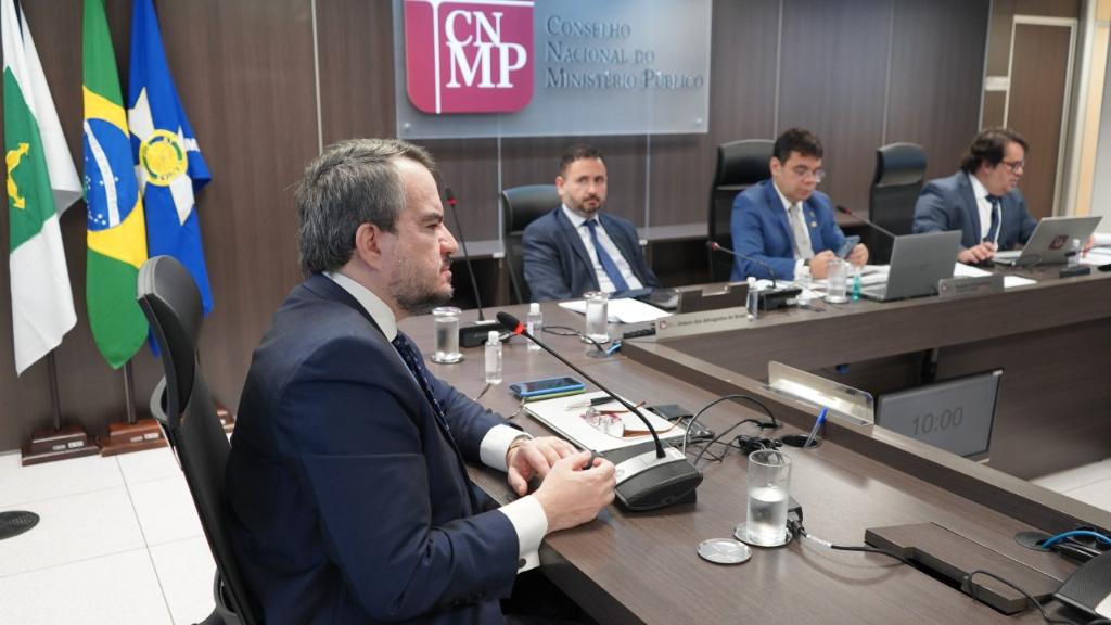 O procurador-geral de Justiça, Luciano Mattos, participou nesta terça-feira (25/04), da 6ª Sessão Ordinária de 2023 do Conselho Nacional do Ministério Público (CNMP), para acompanhar deliberações de interesse institucional. O subprocurador-geral de Justiça de Relações Institucionais e Defesa de Prerrogativas, Marfan Vieira; a presidente do Conselho Nacional de Procuradores-Gerais (CNPG) e procuradora-geral de Justiça da Bahia, Norma Angélica Cavalcanti; o presidente da Associação Nacional dos Membros do Ministério Público (Conamp), Manoel Murrieta e procuradores-gerais de Justiça de vários estados também estiveram presentes. Realizada no plenário da instituição, em Brasília, a sessão foi presidida pelo corregedor nacional do CNMP, conselheiro Oswaldo D’Albuquerque.