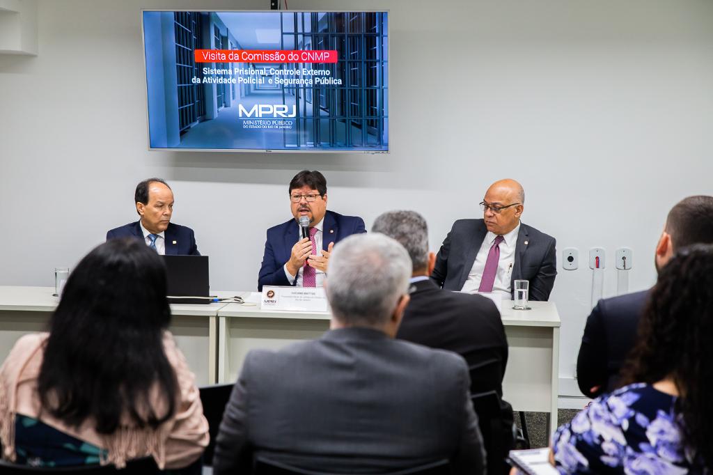 Participaram deste segundo encontro o procurador-geral de Justiça, Luciano Mattos, o presidente da comissão e conselheiro do CNMP, Jaime Miranda, o corregedor-geral do MPRJ, Ricardo Ribeiro Martins, os membros auxiliares da CSP André Martins e Alexandre Saraiva, o coordenador de Segurança e Inteligência, Eduardo Campos, a coordenadora do CAO Execução Penal, Carla Araújo, a subcoordenadora do CAO Investigação Penal, Adriana Lucas, promotores de Execução Penal, de Tutela Coletiva do Sistema Prisional e de Saúde.