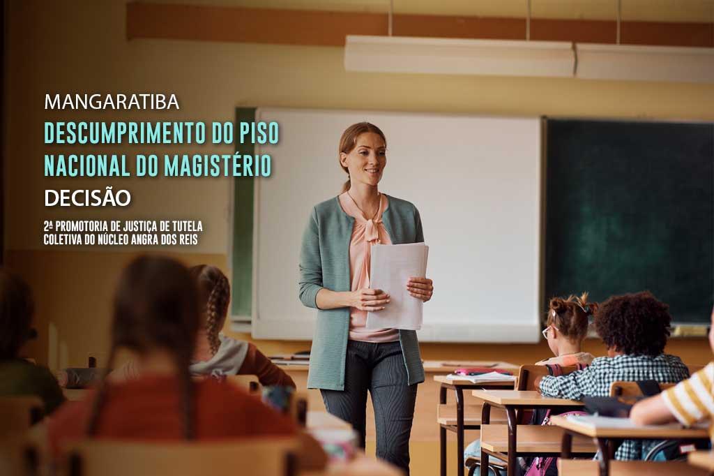 De acordo com o MPRJ, o Município de Mangaratiba insiste na manutenção do pagamento de valores significativamente abaixo do piso salarial nacional da Educação. A promotoria destaca, tomando como exemplo o salário-base estabelecido para os cargos de Professor II, que o valor chega a ser menor do que a metade do mínimo permitido em lei, fixado em R$ 1.193,36 no município, quando deveria ser, ao menos, R$2.403,50.