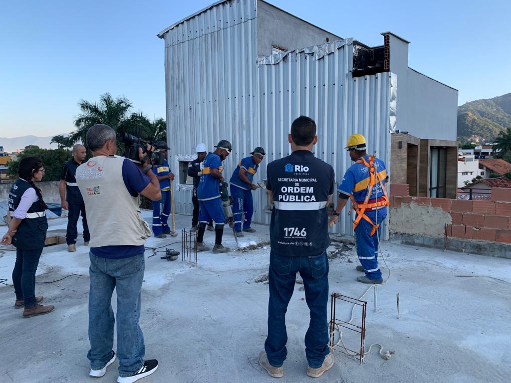 A demolição é feita de forma manual, uma vez que não é possível chegar ao local com máquinas. Também participam da operação agentes da Secretaria de Conservação, da Guarda Municipal, Comlurb e Light.