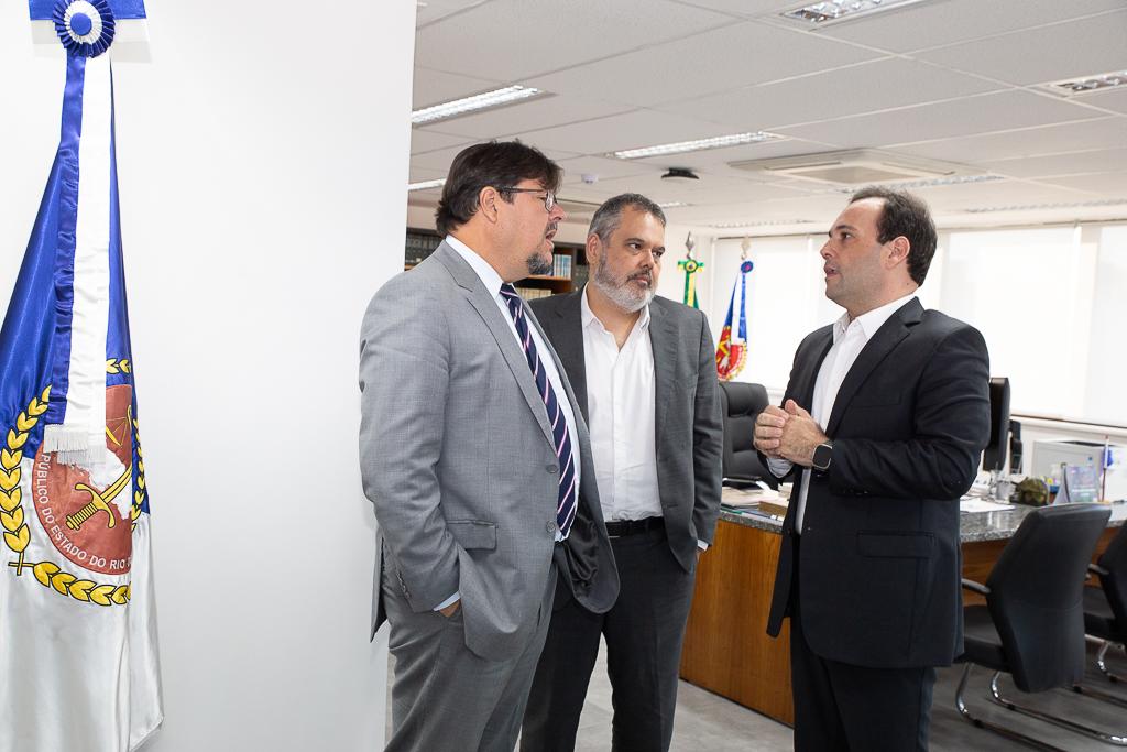 O procurador-geral de Justiça, Luciano Mattos, e o coordenador-geral de Segurança Pública do Ministério Público do Estado do Rio de Janeiro (MPRJ), Alexandre Themístocles, receberam a visita do prefeito de Miguel Pereira e presidente da Associação Estadual dos Municípios do Rio de Janeiro (Aemerj), André Português, nesta terça-feira (19/09). O encontro tratou sobre a participação de representantes das prefeituras no 3º Encontro de Capacitação de Guardas Municipais, que será promovido pelo Instituto de Educação Roberto Bernardes Barroso (IERBB/MPRJ) com previsão para outubro.