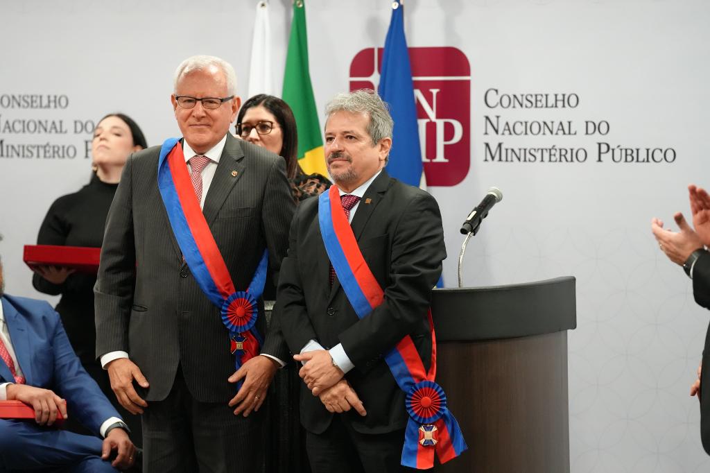 O Conselho da Ordem do Mérito do Conselho Nacional do Ministério Público (CNMP) realizou, nesta segunda-feira (25/09), a sessão de outorga das comendas da Ordem Nacional do Mérito do Ministério Público, no auditório da instituição, em Brasília. Na cerimônia, conduzida pelo presidente do CNMP e chanceler da Ordem, Augusto Aras, foram agraciadas personalidades que prestaram relevantes e significativos serviços ao Ministério Público brasileiro. O subprocurador-geral de Justiça de Relações Institucionais e Defesa de Prerrogativas, Marfan Martins Vieira, foi condecorado pelo conselheiro Rinaldo Reis.