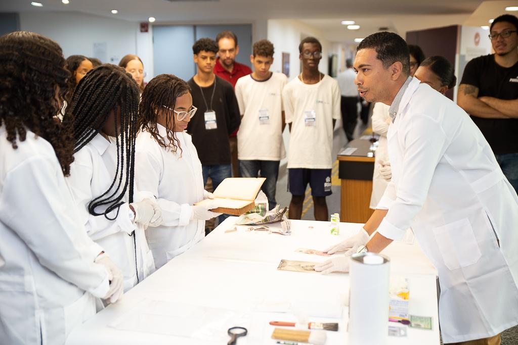 Os alunos também participaram de uma simulação de recebimento de documentos históricos com o arquivista do CDM/MPRJ, Deivson Sabadini, realizando a higienização e acondicionamento de alguns itens documentais. Durante a atividade, enfatizou-se a importância da preservação da memória institucional por meio da gestão de acervos.