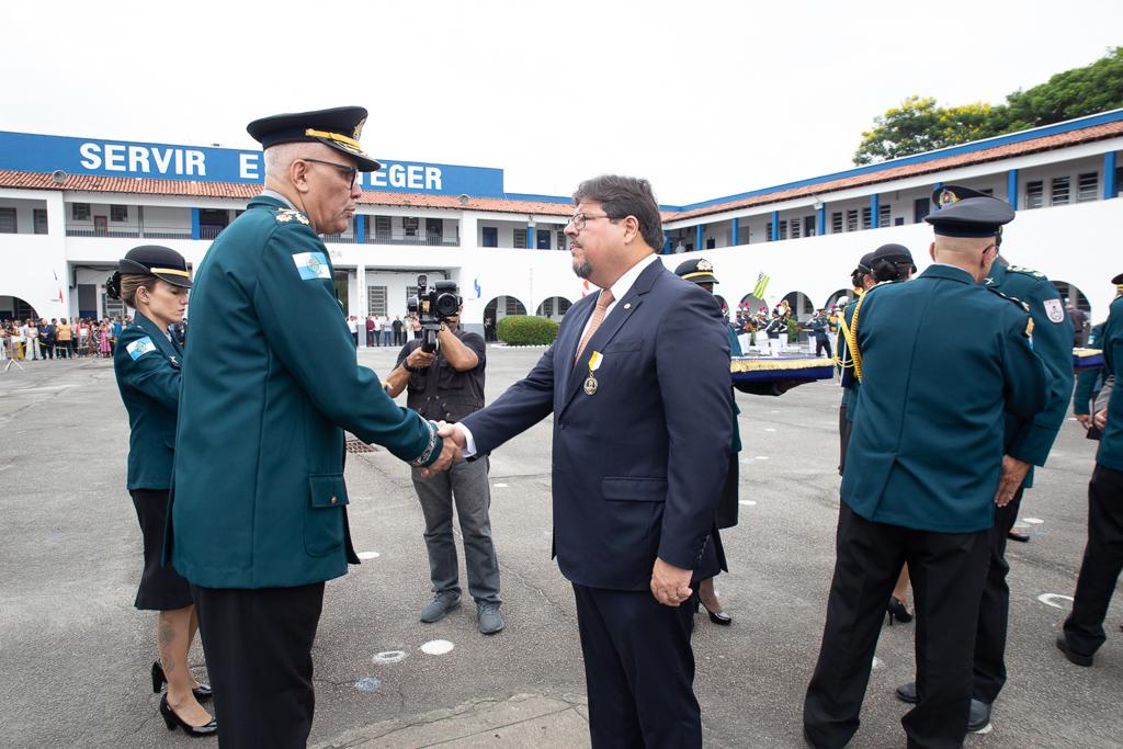 O procurador-geral de Justiça, Luciano Mattos, recebeu, nesta sexta-feira (01/12), a Medalha Mérito General de Brigada José da Silva Pessoa, concedida a pessoas que tenham contribuído para a formação dos futuros oficiais da Polícia Militar. "Agradeço a honraria concedida pela Polícia Militar, que tem se empenhado na cooperação com o Ministério Público, no exercício das nobres funções das duas instituições", destacou o PGJ.