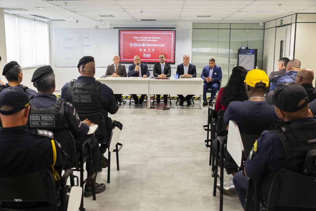 Foi realizado, nesta terça-feira (12/12), o encerramento do curso "A Atuação das Guardas Municipais na Segurança Pública Municipal”, promovido pelo Ministério Público do Estado do Rio de Janeiro (MPRJ) para qualificar guardas municipais das cidades de Rio Bonito, Mesquita, Japeri, Miguel Pereira, Três Rios e Vassouras. Organizado pela Coordenadoria-Geral de Segurança Pública (COGESP/MPRJ) e pelo Instituto de Educação Roberto Bernardes Barroso (IERBB/MPRJ), o curso foi dividido em oito aulas, que abordaram temas como patrulhamento em áreas turísticas, proteção ao idoso, abuso de autoridade, apreensão de adolescentes, entre outros. Nesta última aula, o coronel Gilson Chagas, assessor da COGESP, falou sobre a “Atribuição das Guardas Municipais no cenário da Segurança Pública".