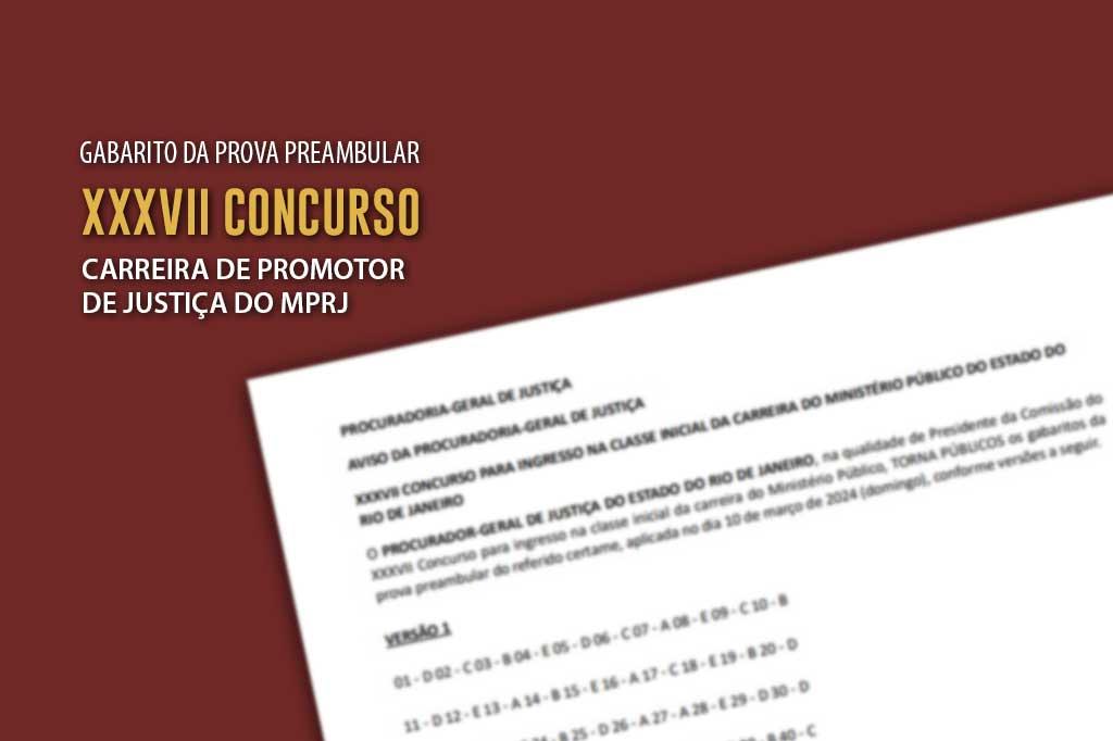 Foi publicado no Diário Oficial do MPRJ desta terça-feira (12/03) o gabarito da prova preambular do XXXVII concurso público para ingresso na carreira de promotor de Justiça do Ministério Público do Estado do Rio de Janeiro (MPRJ). A prova foi aplicada na tarde do último domingo (10/03). Acesse o gabarito neste link.