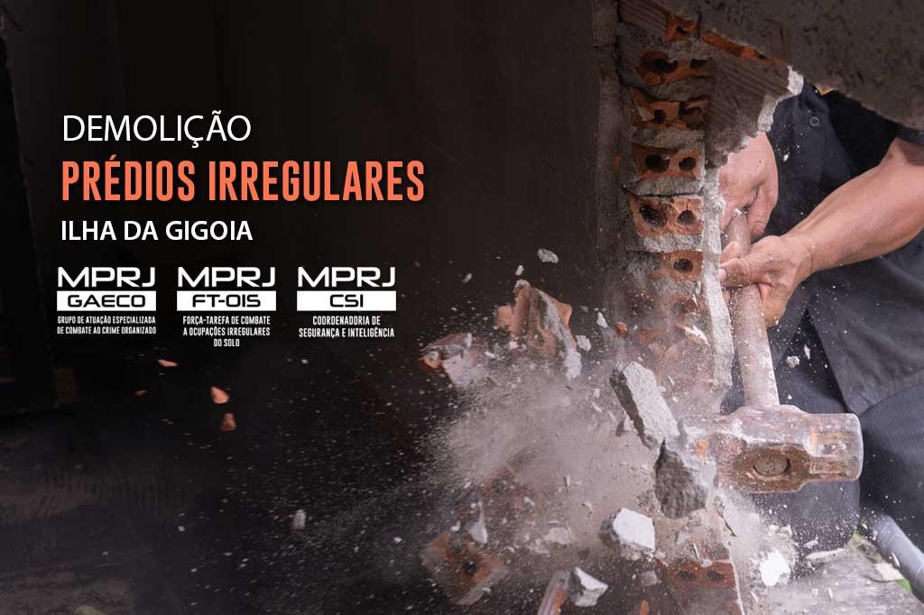 O Ministério Público do Estado do Rio de Janeiro (MPRJ), por meio da Força-Tarefa de Enfrentamento à Ocupação Irregular do Solo Urbano, do Grupo de Atuação Especializada de Combate ao Crime Organizado (GAECO/FT-OIS), em atuação conjunta com a Secretaria Municipal de Ordem Pública (SEOP), realiza nesta segunda-feira (29/04), a demolição de dois prédios construídos irregularmente na Ilha da Gigoia, Zona Oeste do Rio. Um possui três pavimentos e dois apartamentos por andar e o outro, também com três pavimentos, sendo quatro apartamentos por andar. Ambos foram erguidos sem qualquer autorização da Prefeitura. Estima-se um prejuízo no valor de R$ 3,5 milhões aos responsáveis pela obra.