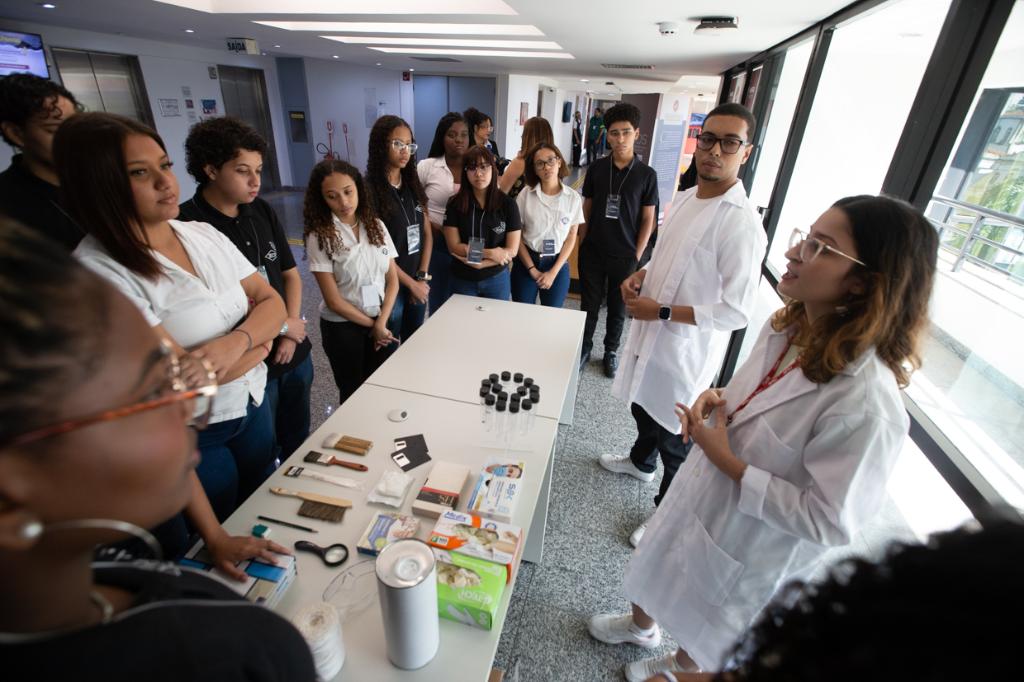 Em seguida, os jovens participaram de uma atividade prática voltada ao aprendizado sobre documentação e cuidados para preservação, conduzida pelo responsável técnico do Memorial, Deivson Sabadini, pelo arquivista do CDM/MPRJ, Kevyn Gonçalves, e pela estagiária de museologia, Mylena Felix. Quatro alunos se voluntariaram para uma simulação de recebimento de documentos históricos, onde aprenderam os processos de higienização e acondicionamento.