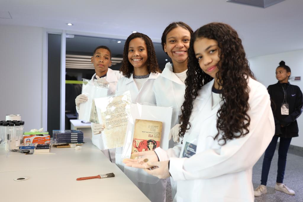 Em seguida, os jovens participaram de uma atividade prática sobre documentação e cuidados para preservação, conduzida pelo responsável técnico do Memorial, Deivson Sabadini, e pelo arquivista do CDM/MPRJ, Kevyn Gonçalves. Após aprenderem sobre a metodologia utilizada na preservação dos documentos centenários do acervo custodiado pelo setor, quatro alunos se voluntariaram para uma simulação de recebimento de documentos históricos, onde aprenderam os processos de higienização e acondicionamento adequado, Por fim, os alunos tiraram fotos utilizando com uma beca de procurador de Justiça, simulando uma solenidade.