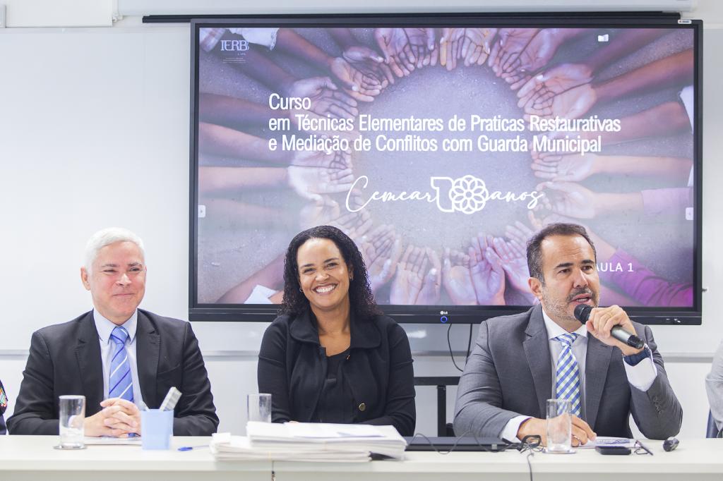 O Instituto de Educação Roberto Bernardes Barroso do Ministério Público do Estado do Rio de Janeiro (IERBB/MPRJ) encerrou, nesta sexta-feira (26/07), o curso "Técnicas Elementares de Práticas Restaurativas e Mediação de Conflitos". O programa, destinado à capacitação de agentes das Guardas Municipais do Rio de Janeiro, São Gonçalo e Tanguá, teve sua cerimônia de encerramento e última aula realizadas no mesmo dia. A programação começou com uma palestra do Grupamento de Ronda Escolar (GRE), que abordou a legalidade no contexto escolar, especialmente em relação a grupos minoritários e a crianças e adolescentes. Em seguida, foi realizada a solenidade de encerramento.