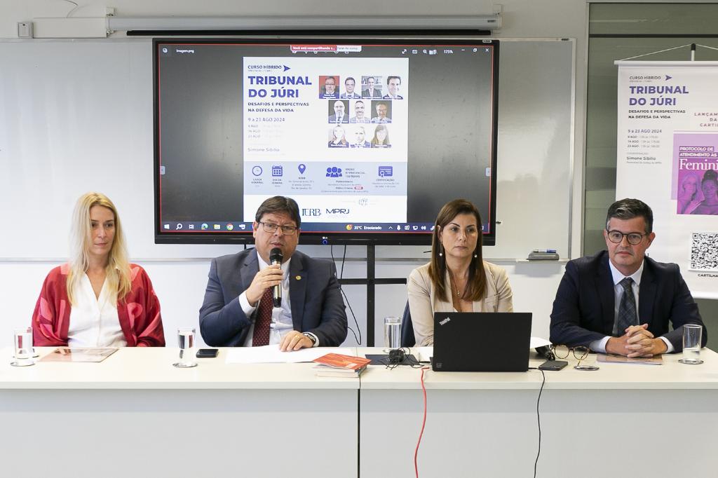 O procurador-geral de Justiça, Luciano Mattos, participou, nesta sexta-feira (23/08), do terceiro e último dia do curso “Tribunal do Júri: desafios e perspectivas na defesa da vida”, coordenado pela promotora de Justiça Simone Sibilio e promovido pelo Instituto de Educação Roberto Bernardes Barroso (IERBB/MPRJ). Realizado sempre às sextas-feiras, durante toda a tarde, o curso teve aulas nos dias 09/08 e 16/08 e abordou questões práticas relacionadas à atuação dos membros do Ministério Público junto ao Tribunal do Júri, contando com palestras de membros do Ministério Público do Estado do Rio de Janeiro (MPRJ) e de MPs de outros estados.