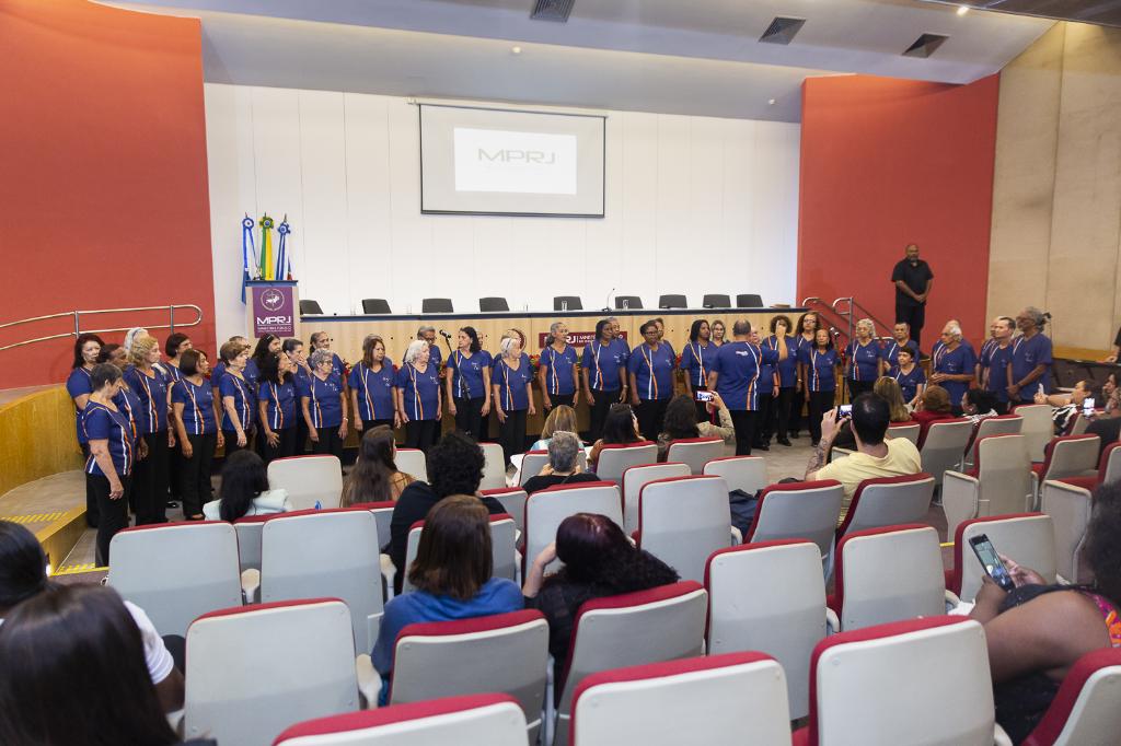 As doutoras Denise Vidal e Elisa Macedo terminaram o último painel apresentando como o MPRJ tem atuado na implementação da Política Pública para a Pessoa Idosa, convidando representantes dos municípios de Niterói, Itaguaí e Itaperuna para compartilhar as experiências acerca do tema 'dignidade do idoso no acesso à saúde'. O Coral Avós do Canto fechou o evento, após a entrega de certificados, com uma apresentação que sustenta os preceitos do Encontro Estadual de Saúde da Pessoa Idosa, o envelhecimento saudável, nesse caso baseado na música, apresentado durante a performance do grupo, que emocionou os presentes.
