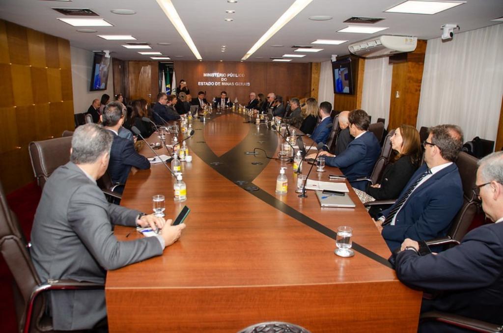 O procurador-geral de Justiça, Luciano Mattos, e os PGJs de Minas Gerais, Jarbas Soares Júnior; de São Paulo, Paulo Sérgio de Oliveira e Costa; e do Espírito Santo, Francisco Martínez Berdeal, que compareceu virtualmente, participaram, na tarde desta segunda-feira (21/10), na sede do Ministério Público do Estado de Minas Gerais (MPMG), de mais uma edição do Encontro de Procuradores-Gerais de Justiça da Região Sudeste. A reunião debateu formas de cooperação e unidade institucional.