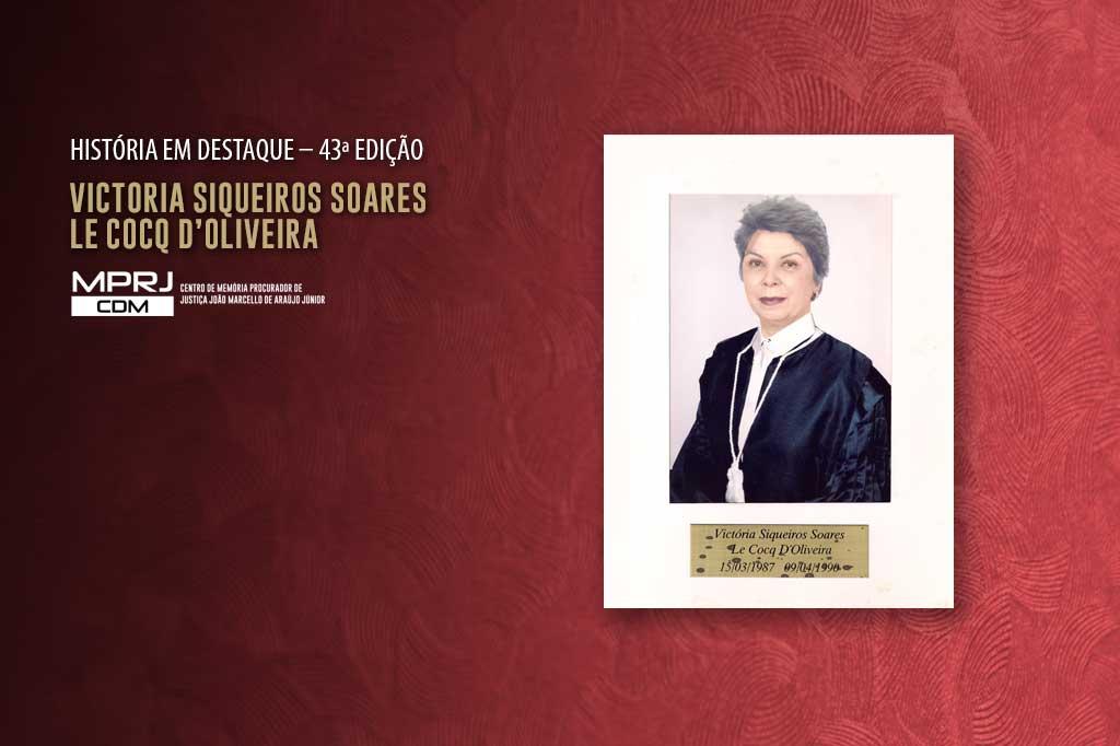 O Centro de Memória João Marcello de Araújo Júnior (CDM/MPRJ) apresenta, na 43ª edição do projeto História em Destaque, a trajetória institucional da procuradora de Justiça Victoria Siqueiros Soares Le Cocq D’Oliveira por meio de sua fotografia como diretora-geral da Secretaria da Procuradoria Geral de Justiça, em 1987.