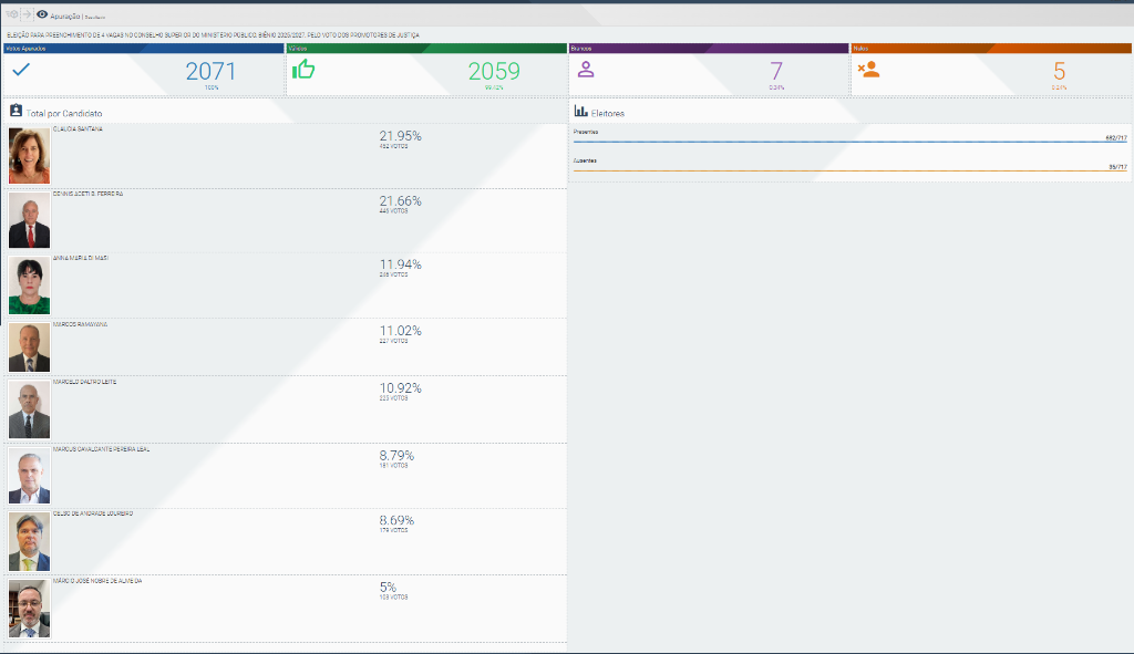 Já pelo voto dos promotores de Justiça, os eleitos foram Gláucia Maria da Costa Santana (452 votos), Dennis Aceti Brasil Ferreira (446 votos), Anna Maria Di Masi (246 votos) e Marcos Ramayana Blum de Moraes (227 votos), com um total de 2059 votos válidos, 5 nulos e 7 brancos.