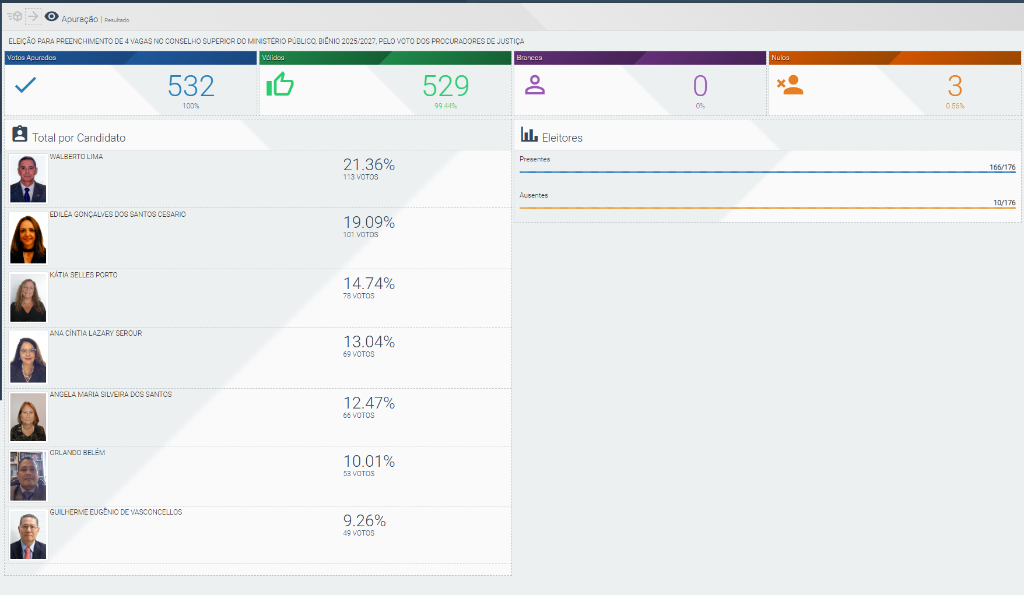 Pelo Colégio de Procuradores de Justiça, foram eleitos os procuradores Walberto Fernandes de Lima (113 votos), Ediléa Gonçalves dos Santos Cesario (101 votos), Katia Aguiar Marques Selles Porto (78 votos) e Ana Cíntia Lazary Serour (69 votos) com um total de 529 votos válidos e três nulos.