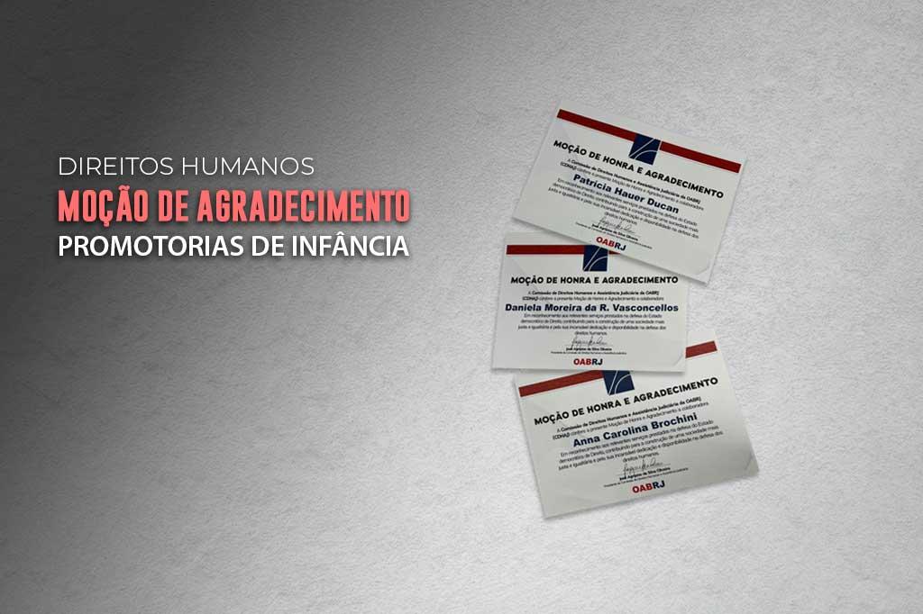 As promotoras de Justiça Patrícia Hauer, Anna Carolina Brochini e Daniela Vasconcellos receberam moção de honra e agradecimento da Comissão de Direitos Humanos e Assistência Judiciária da OAB-RJ. A homenagem foi concedida em reconhecimento aos relevantes serviços prestados na defesa do Estado Democrático de Direito, à dedicação na defesa dos direitos humanos e pela contribuição para a construção de uma sociedade mais justa e igualitária.
