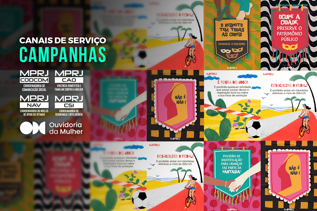 Uma das campanhas, focada no Carnaval, inclui cards com dicas essenciais, como identificar crianças e respeitar a diversidade. A primeira publicação destaca o tema "Não é Não!", reforçando a importância do combate ao assédio para garantir uma folia segura. Essa publicação foi idealizada em parceria com o Centro de Apoio Operacional das Promotorias de Justiça de Combate à Violência Doméstica e Familiar contra a Mulher (CAO Violência Doméstica/MPRJ), a Subprocuradoria-Geral de Justiça de Direitos Humanos e Proteção à Vítima e o Núcleo de Apoio às Vítimas (NAV/MPRJ).