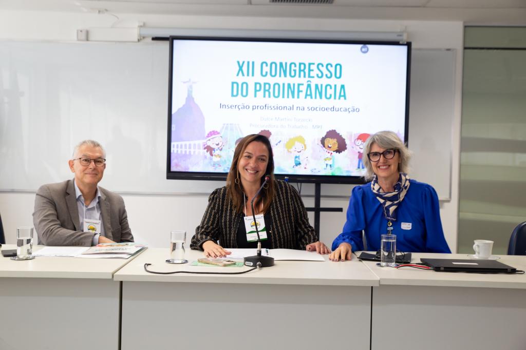 Na primeira atividade do dia, a coordenadora da Força-Tarefa do Departamento Geral de Ações Socioeducativas (FT-Degase/MPRJ), Fernanda Sodré, mediou a mesa de debates “Inserção profissional e estratégias de educação e ressocialização na socioeducação”, que contou com palestras da procuradora do Ministério Público do Trabalho (MPT) no Rio de Janeiro, Dulce Martini Torzecki, e do promotor de Justiça do Ministério Público do Distrito Federal e Territórios (MPDFT), Márcio Costa de Almeida.