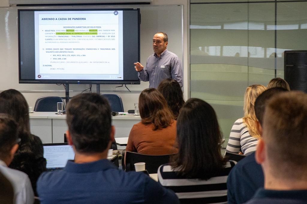 Na primeira palestra do dia, o auditor fiscal da Receita Estadual, Waldyr Costa de Vilhena, falou sobre inteligência fiscal. Durante sua explanação, o especialista abordou técnicas utilizadas para auxiliar investigações relacionadas a crimes fiscais e contra a ordem econômica, destacando como obter informações qualificadas a partir de bancos de dados e fontes abertas.
