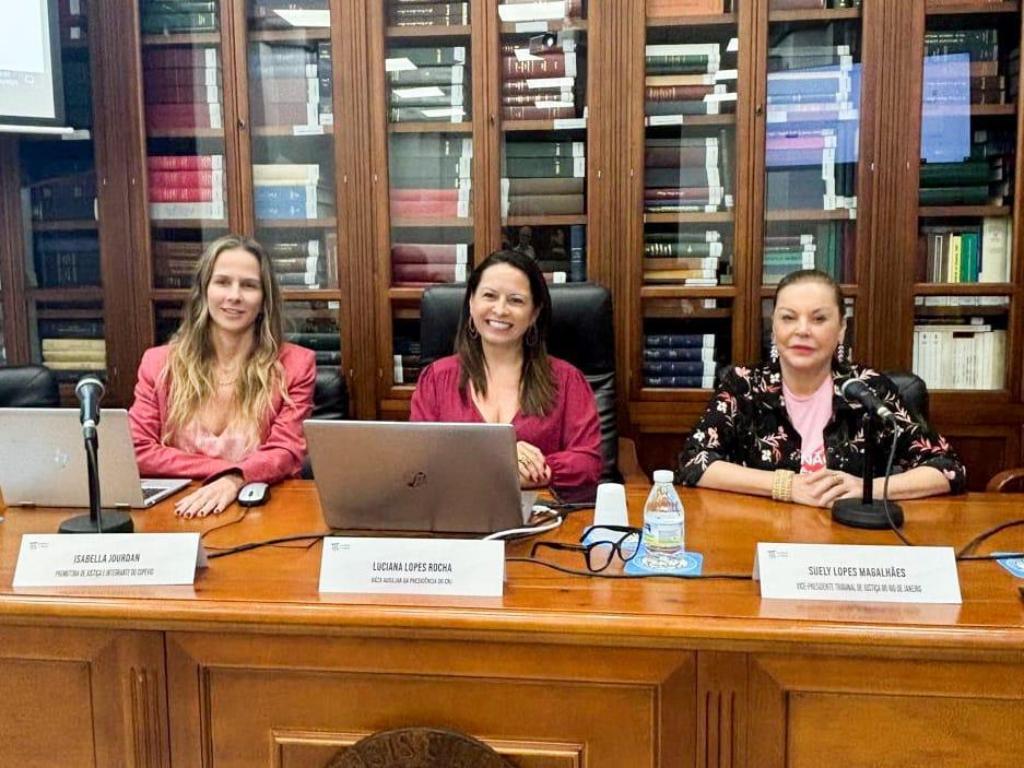 A promotora de Justiça Isabela Jourdan, coordenadora do Centro de Apoio Operacional das Promotorias de Justiça de Combate à Violência Doméstica e Familiar contra a Mulher (CAO Violência Doméstica e Familiar contra a Mulher/MPRJ) e integrante da Comissão Permanente de Combate à Violência Doméstica e Familiar contra a Mulher do Ministério dos Direitos Humanos e da Cidadania, participou da mesa redonda “A perspectiva brasileira”, ao lado da vice-presidente do Tribunal de Justiça do Estado do Rio de Janeiro, Suely Lopes Magalhães, e da juíza auxiliar da presidência do Conselho Nacional de Justiça (CNJ), Luciana Lopes Rocha.