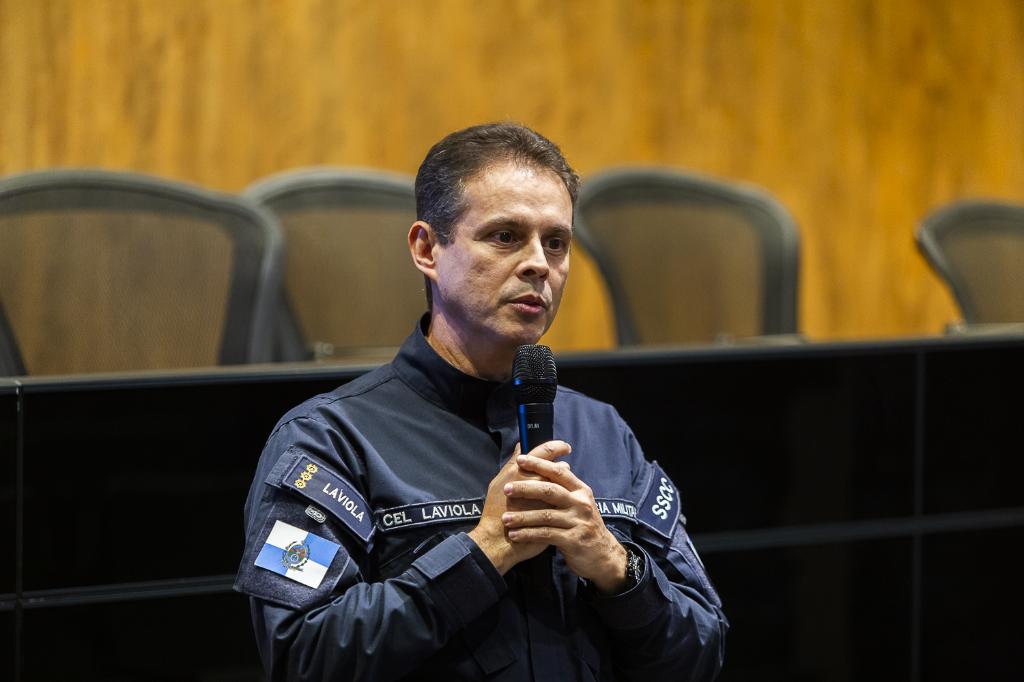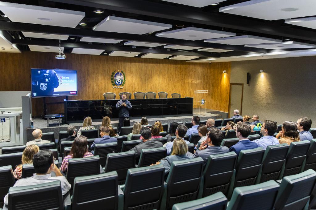 No auditório, os promotores assistiram a duas palestras: a primeira sobre o sistema operacional das câmeras portáteis utilizadas pelos policiais militares, ministrada pelo diretor de Infraestrutura e Tecnologia do CICC, major Agdan Fernandes. A segunda, apresentada pela tenente-coronel Valquiria Mesquita e pela capitã Anne Monteiro, da Comissão de Avaliação de Requisições, Resguardo e Divulgação (CARRD), abordou como são tratadas as solicitações de acesso a gravações das câmeras portáteis. Em seguida, os membros estiveram na central 190 da PM e na sala de operações e inteligência, onde puderam conhecer o sistema de reconhecimento facial.