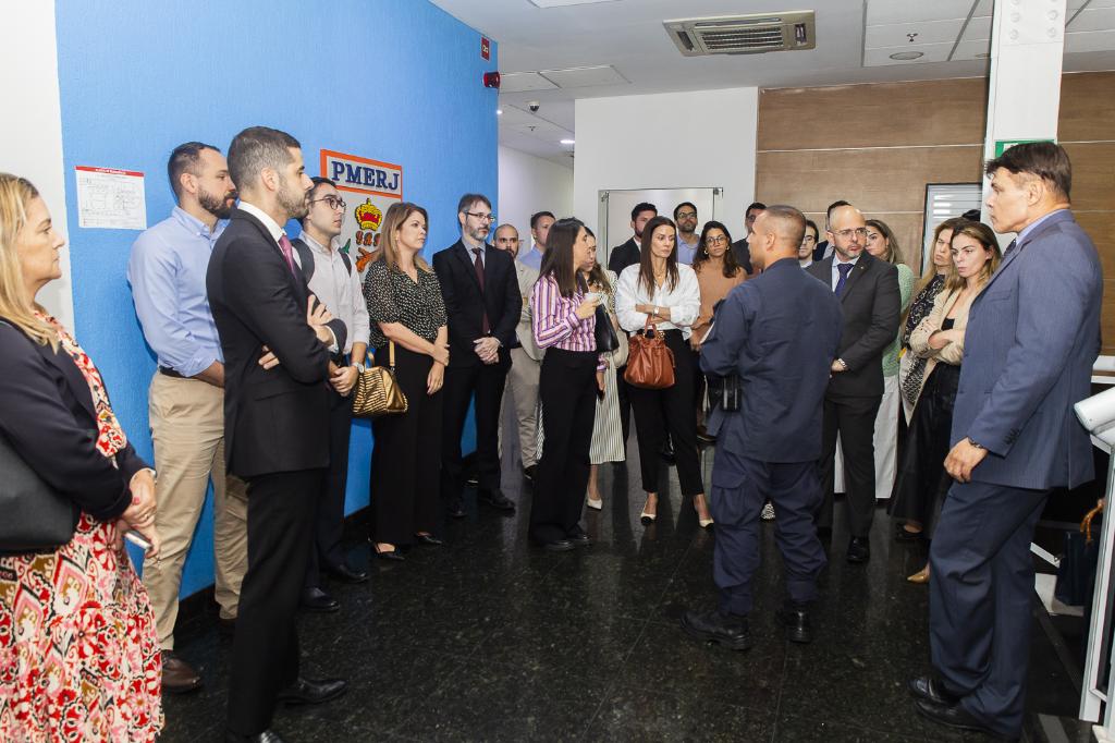 Promotores de Justiça do Ministério Público do Estado do Rio de Janeiro (MPRJ) estiveram, na manhã desta sexta-feira (06/06), no Centro Integrado de Comando e Controle (CICC), na Cidade Nova, para conhecer a estrutura e o funcionamento do prédio, que abriga as forças de segurança. Os membros, que atuam em promotorias criminais, de investigação penal e no Júri, foram recebidos pelo subsecretário de Comando e Controle, coronel Fábio Laviola. A coordenadora e a subcoordenadora do Centro de Apoio Operacional das Promotorias de Justiça de Investigação Penal (CAO Investigação Penal/MPRJ), Luciana Benisti e Anna Gabriella Gama Taunay, e a subcoordenadora do Centro de Apoio Operacional das Promotorias de Justiça Criminais (CAO Criminal/MPRJ), Roberta Maristela dos Anjos, também estiveram no CICC.