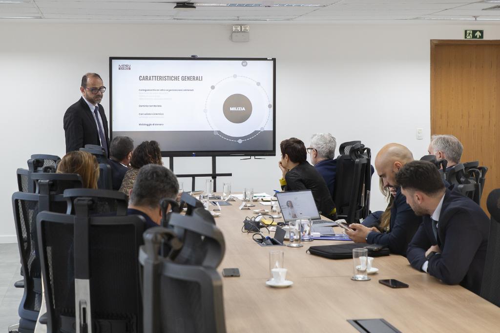 Após o encontro com o procurador-geral de Justiça, a comitiva italiana conheceu detalhes do Grupo de Atuação Especializada de Combate ao Crime Organizado (GAECO/MPRJ). A coordenadora do grupo, promotora de Justiça Letícia Emile, apresentou um panorama das principais características da criminalidade organizada no Brasil, destacando semelhanças com a máfia italiana, como o controle territorial e o uso sistemático da violência como instrumento de intimidação. Também foram abordados os vínculos desses grupos com esquemas de corrupção sistêmica e práticas sofisticadas de lavagem de dinheiro. Os promotores de Justiça Fabio Corrêa e Gabriela de Aguillar, subcoordenadores do GAECO/MPRJ, participaram da apresentação. Corrêa, que também coordena o Grupo de Atuação Especializada em Segurança Pública (GAESP/MPRJ), apontou as características das milícias, que hoje representam uma das principais formas de crime organizado no país. Formadas, em grande parte, por agentes de segurança, as milícias cresceram, passaram a controlar territórios e expandiram sua influência sobre diversas atividades econômicas locais.