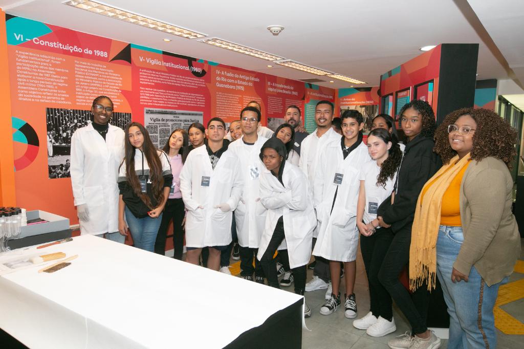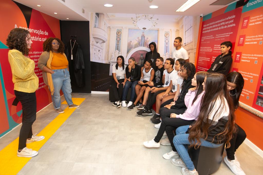 Na exposição, o grupo foi conduzido pela historiadora Nayara Cristina dos Santos e pela estagiária de História Samara Tarouquela, que iniciaram a mediação com uma breve apresentação da equipe e dos visitantes. A partir de uma abordagem didática e interativa, com a exploração do espaço, que conta com imagens, objetos e documentos, a equipe do CDM/MPRJ contextualizou os estudantes sobre a formação histórica, atribuições e áreas de atuação do Ministério Público e os papéis dos três poderes (Legislativo, Executivo e Judiciário), reforçando o caráter educativo da iniciativa.