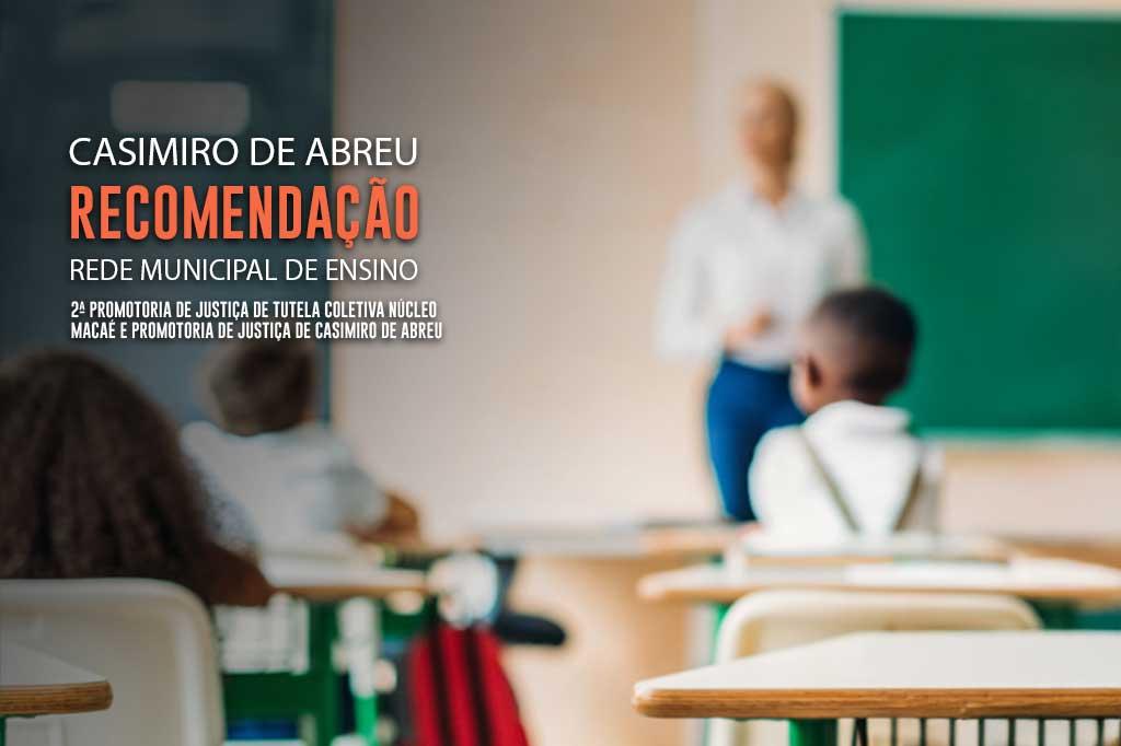 O Ministério Público do Estado do Rio de Janeiro (MPRJ), por meio da 2ª Promotoria de Justiça de Tutela Coletiva – Núcleo Macaé e da Promotoria de Justiça de Casimiro de Abreu, recomendou a adoção de providências urgentes para regularizar o quadro de professores e garantir o fornecimento de merenda escolar nas unidades da rede municipal. A Recomendação foi direcionada ao prefeito Ramon Dias Gidate e à secretária municipal de Educação, Gracenir Alves de Oliveira. O prazo para informar ao MPRJ as medidas adotadas é de 24 horas.