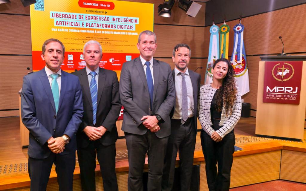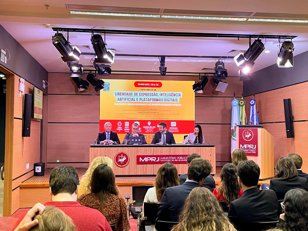 O Ministério Público do Estado do Rio de Janeiro, por meio da Assessoria Internacional e do Instituto de Educação Roberto Bernardes Barroso (IERBB/MPRJ), realizou, na segunda-feira (18/08), o curso híbrido “Liberdade de expressão, inteligência artificial e plataformas digitais: uma análise jurídica comparada à luz do Direito brasileiro e espanhol”. O evento, realizado no auditório Procuradora de Justiça Vera de Souza Leite, reuniu especialistas para debater a influência que as novas tecnologias têm exercido na sociedade ao redor do mundo.