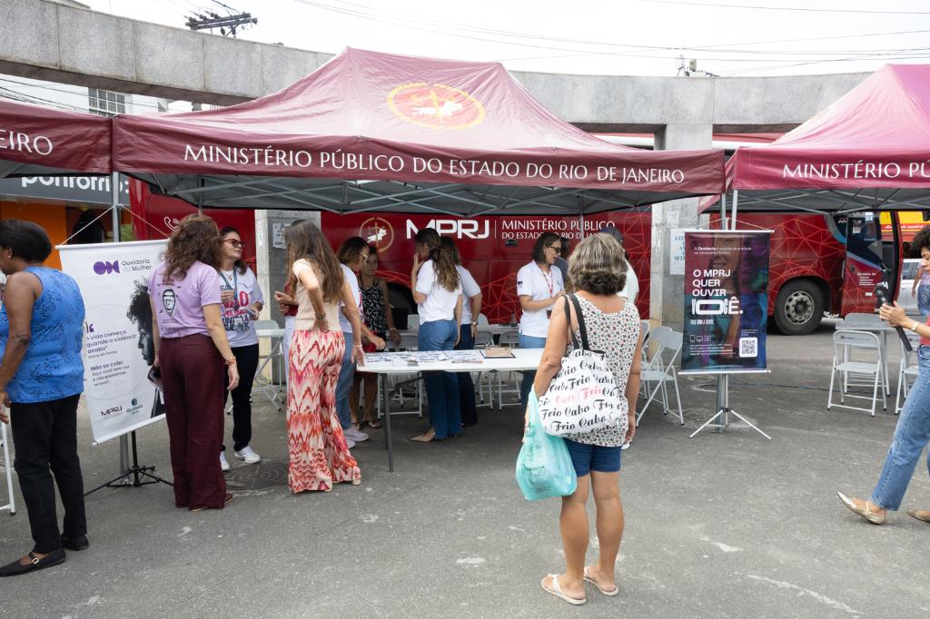 A Ouvidoria Itinerante da Mulher do Ministério Público do Estado do Rio de Janeiro (MPRJ) esteve, nesta quarta-feira (18/03), na Praça Luiz Palmier, no Centro de São Gonçalo, para prestar atendimentos à população local. A iniciativa integra o projeto “MP Movimenta Mulher”, uma ação conjunta da Ouvidoria da Mulher, do Grupo Executivo Temporário de Integração no Combate à Violência de Gênero contra a Mulher (GET-VIM/MPRJ) e do Centro de Apoio Operacional das Promotorias de Justiça de Combate à Violência Doméstica e Familiar contra a Mulher (CAOVD/MPRJ). Estiveram presentes a coordenadora e a subcoordenadora do CAOVD/MPRJ, Isabela Jourdan e Eyleen Marenco, e a coordenadora da Ouvidoria da Mulher do MPRJ, Karina Tavares.
