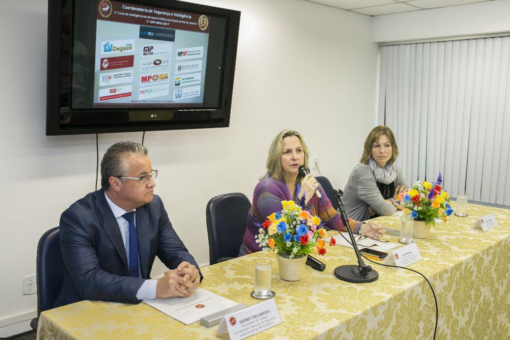 Participaram da mesa de abertura a coordenadora da CSI/MPRJ, Elisa Fraga de Rego Monteiro, a subcoordenadora da CSI/MPRJ, Andréa Rodrigues Amin, e o procurador de justiça do Ministério Público de Santa Catarina e coordenador do Comitê de Políticas de Segurança Institucional (CPSI) do Conselho Nacional do Ministério Público (CNMP), Sidney Dalabrida. A abertura do evento contou ainda com a participação do diretor da Divisão de Inteligência da CSI e coordenador do curso, coronel Sérgio Ribeiro.