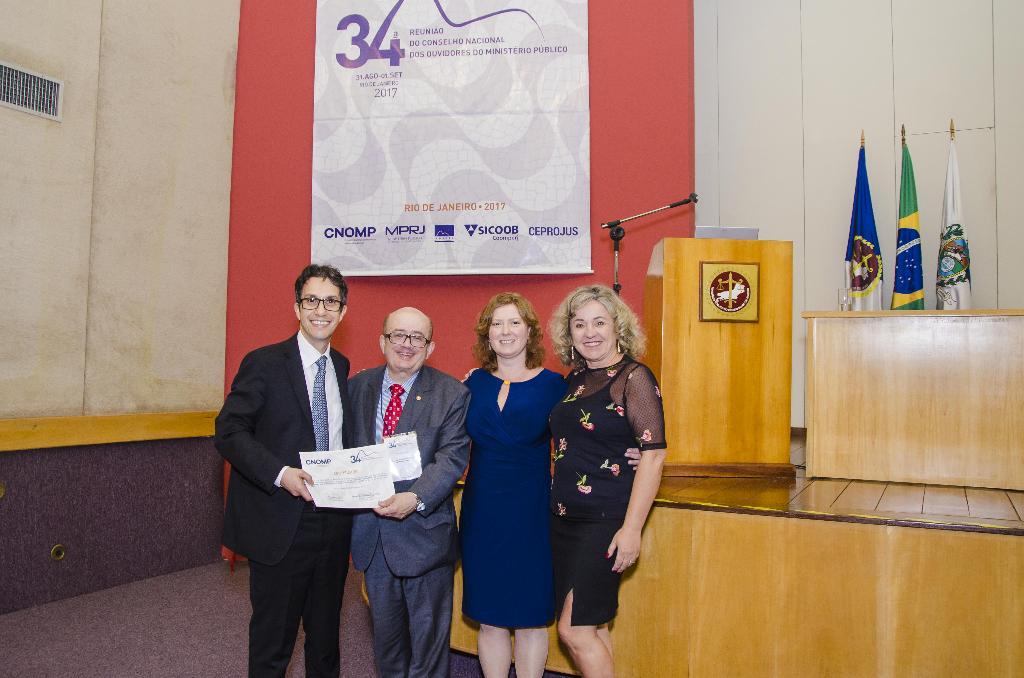 Georgea Marcovecchio Guerra foi homenageada no encerramento do evento, juntamente com o servidor Carlos Airton Coelho, supervisor da Ouvidoria do MPRJ, e o ex-ouvidor do MP do Espírito Santo, procurador de Justiça Eliezer Siqueira de Souza.