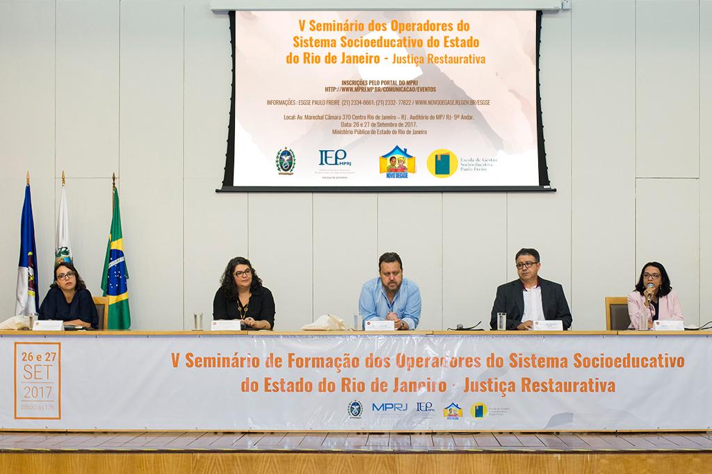 O Ministério Público do Estado do Rio de Janeiro (MPRJ), por meio do Instituto de Educação e Pesquisa (IEP/MPRJ), sediou, nos dias 26 e 27 de setembro, o “V Seminário de Formação dos Operadores do Sistema Socioeducativo do Estado do Rio de Janeiro – Justiça Restaurativa”. O evento organizado em parceria com o Departamento Geral de Ações Socioeducativas do Estado do Rio de Janeiro (DEGASE) lotou o auditório do edifício-sede do MPRJ nos dois dias de encontro.
